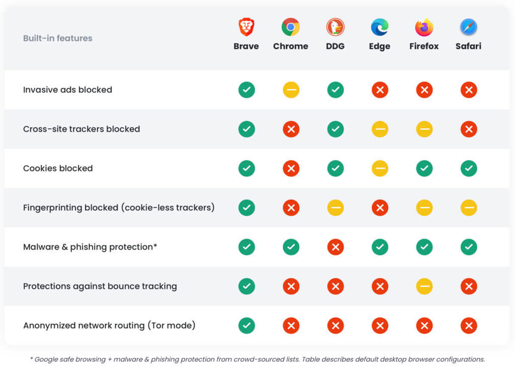In our comparison table we compared the most frequent used browsers like Microsoft Edge, Mozilla Firefox, Google Chrome to lesser known browsers like DuckDuckGo and Brave.
